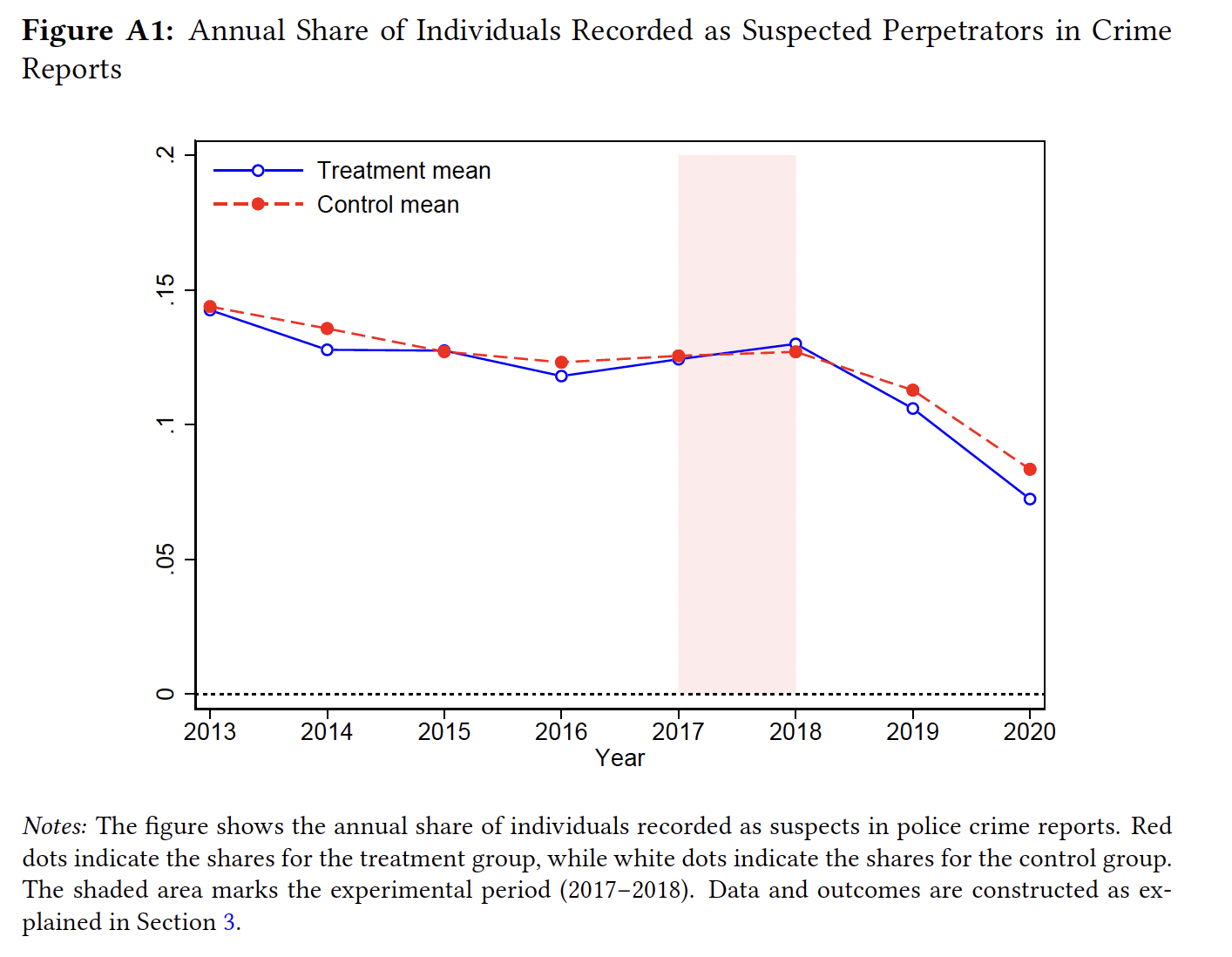 La zone ombrée du graphique correspond à la période de versement du revenu de base (2017–2018). Les trajectoires quasi identiques des deux groupes indiquent l’absence d’effet du revenu de base sur la probabilité d’être suspecté d’une infraction.